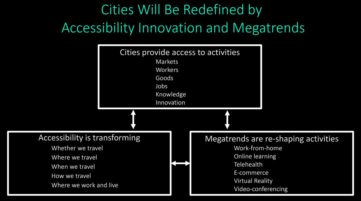 Future accessibility enhancements will fundamentally change how we live. Consider cities: throughout the history of civilization, people and enterprises have located in cities to access markets, workers, goods, jobs, education, ideas, religion, culture, knowledge and healthcare. These fundamental drivers of urbanization now are being redefined by enhanced accessibility and megatrends reshaping activities.