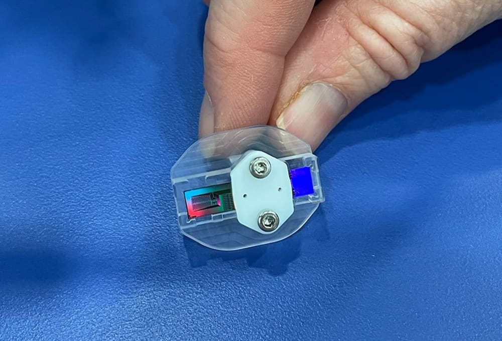“We graft the peptides onto a slicken surface using a chemical process. With this the sensor we’ve created recognizes a pattern based on interferometry, which is much more cost-effective and scalable than the previous SPR [surface plasmon resonance) reflective technology we were using in early development,” Jordan explained. “So, it’s not doing chemical analysis; it’s doing pattern recognition and turning the pattern into the equivalent of a picture. We then store that picture as a ‘fingerprint’ in a digital library for recall.”