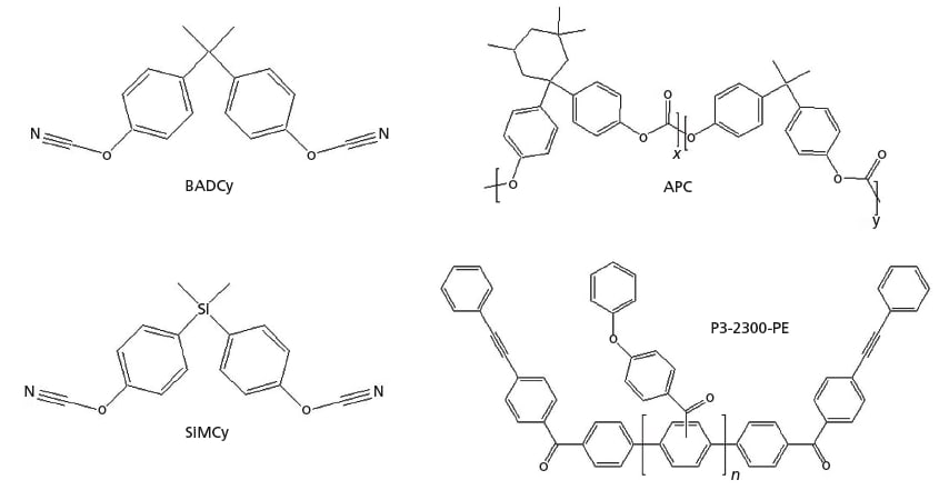 These resins were derived from the di(cyanate ester) of dimethyldi(p-phenol) silane [abbreviated “SiMCy”], which is a silicon-containing analog of BADCy. This resin melts at 59°C. Samples of this resin, without and with APC as a toughening agent, were cast in molds in the same manner as that of the toughened BADCy resins.