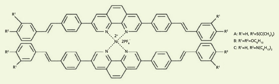 Accomplishments in this category include investigation of degenerate nonlinear absorption and optical-power-limiting properties of asymmetrically substituted stilbenoid chromophores; synthesis and characterization of novel two-photonabsorbing, 1,10-phenanthroline-containing, p-conjugated chromophores and nickel( II)-chelated complexes thereof (see figure) with quenched emissions; synthesis and characterization of two- and three-photon- absorbing novel fluorene-containing ferrocene derivatives; synthesis and testing of novel-conjugated dendritic nanosized chromophores with enhanced two- and three-photon absorption; and demonstration of limiting and stabilization of optical power by use of novel two-photon-absorbing liquid dye salt systems. The major advantage of using a neat liquid dye salt as the two-photon-absorbing medium is that the concentration of two-photon-absorbing chromophores is unusually high (of the order of 1 M) and it can withstand a relatively high-input laser power and energy.