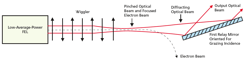 The focusing of the electron beam and the desired consequent pinching of the optical beam at the output end of the wiggler could be effected by application of an externally generated magnetic field or by utilizing the betatron oscillation of the electron-beam envelope. Pinching of the optical beam would reduce its Rayleigh length, thereby making it possible to put the first relay mirror closer to the wiggler without exceeding the damage threshold. The mirror would be oriented for grazing incidence to reduce the intensity at incidence and thereby increase the damage threshold. The combination of pinching the optical beam and grazing incidence would enable placement of the first relay mirror at or perhaps closer than a distance of 3μm from the output end of the wiggler.