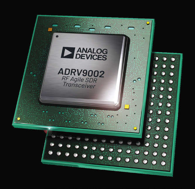 How much functionality is available for an A&D system from a single SiP? Two miniature systems from Analog Devices demonstrate the impressive functional capabilities from a single packaged device. Model ADRV9002 SiP is a mixed-signal, 2 transmitter × 2 receiver transceiver SiP with complete receiver and transmitter subsystems capable of channel bandwidths from 12 kHz to 40 MHz across a frequency range of 30 MHz to 6 GHz. It is housed in a 12 × 12 mm, 196-ball CSP_BGA package (Fig. 1). This transceiver SiP is fully programmable via a four-wire serial peripheral interface (SPI) and is available with optional low-voltage differential signaling (LVDS) and CMOS synchronous serial data interfaces. Its mixed-signal architecture (Fig. 2) provides linear direct conversion of radio signals, aided by quadrature error correction (QEC) and programmable digital filters. General-purpose input and output ports are provided for monitoring and control.