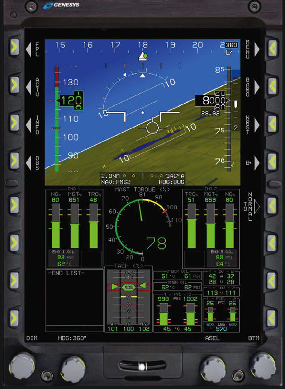 The Genesys electronic flight instrument system (EFIS) with synthetic vision system (SVS) and terrain awareness and warning system (TAWS) was the first flight display certified by the FAA to use synthetic vision technology and highway-in-the-sky (HITS) navigation, where the pilot is presented a simulated 3D depiction of the environment ahead of the aircraft, including conformal terrain, towers, traffic, navigation aids, and runways, all generated using FAA-certified databases and sensor inputs. It was also the world’s first Technical Standard Order (TSO) C146 certified global positioning system/satellite-based augmentation system (GPS/ SBAS) navigation system.