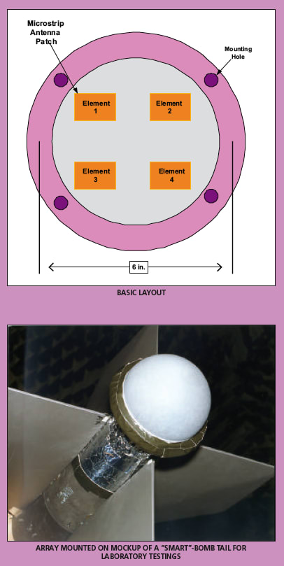 In its present form, the miniaturized GPS CRPA (see figure) includes a 6-in.- (15.2-cm)-diameter dielectric substrate with a ground plane on its inner surface, four rectangular microstrip patch antenna elements in a square array on its outer surface, and a superstrate (a dielectric lens) covering the antenna elements. The two elements on each side of the square are separated by half a dielectric wavelength (which is smaller than half a vacuum wavelength). The substrate material is chosen to have a permittivity large enough that the antenna elements can be made significantly smaller and significantly closer together than would be necessary if the dielectric were a vacuum. The permittivity and shape of the dielectric lens are chosen to minimize the mutual coupling between the antenna elements and to contribute to the overall reduction in size while enabling the array to exhibit the beam-forming or null-forming performance of a half-vacuum-wavelength antenna array.