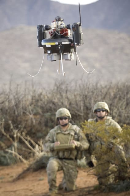 It operates like a small remote-controlled helicopter and can easily fly down to inspect hazardous areas for threats without exposing soldiers to enemy fire. The MAV also has the unique ability to take off and land vertically from complex desert and urban terrains without using runways or helipads.
