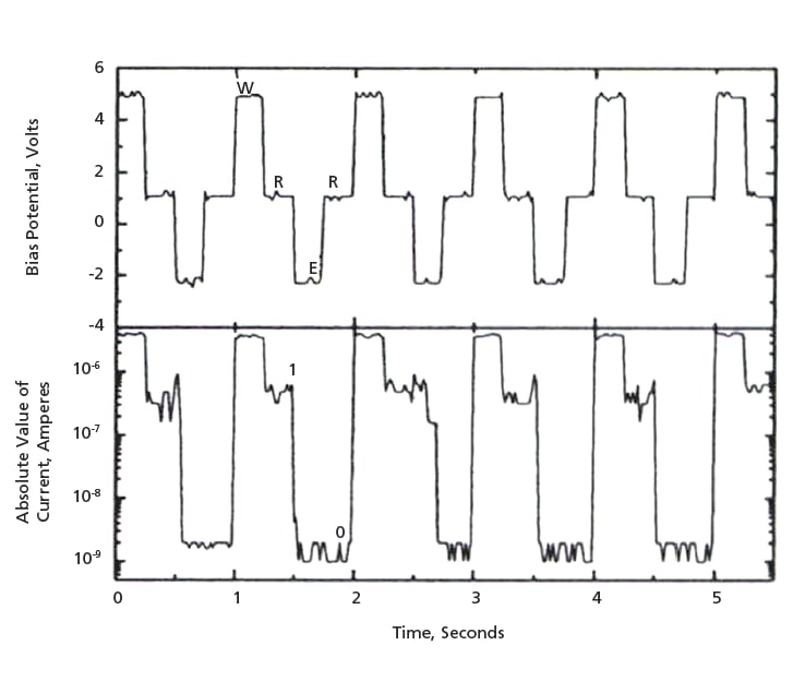 The figure presents measurement data from an experiment that demonstrated switching between the high- and low-conductance states, which could be taken to represent binary "1" and "0," respectively. The device was written, read, and erased repeatedly: A potential of 5 V was applied to write "1"; that is, to switch the device to the high-conductance state. The state was read by applying a lower potential (1.1 V). The current during the reading of the "1" state was 10-7 A. The "1" state was erased by applying a potential of -2.3 V, which switched the device to the low-conductance "0" state. Upon application of the reading potential of 1.1 V, the device responded at a "0"-state current of the order of 10-9 A. These write-read-erase cycles demonstrate that the device could be used as a nonvolatile memory device. Other measurements, not illustrated in the figure, have been interpreted as signifying that reading and writing can be accomplished by pulses as short as 25 ns.