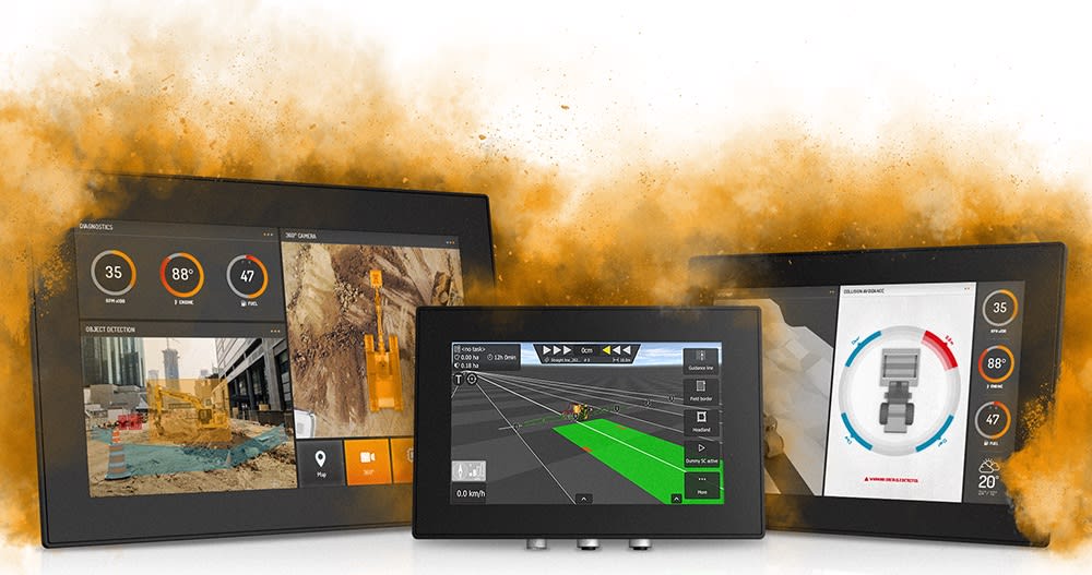 The greater performance of the larger CCpilot V1000 and V1200 displays allows for the system to be used for productivity, awareness and safety solutions. The higher rate of detections and application processor headroom can deliver simultaneous deployment of multiple applications. For example, task guidance with AI support, object detection within the video feed (to offer additional situational awareness to the driver), and general machine information, with all three applications shown concurrently on a single display.