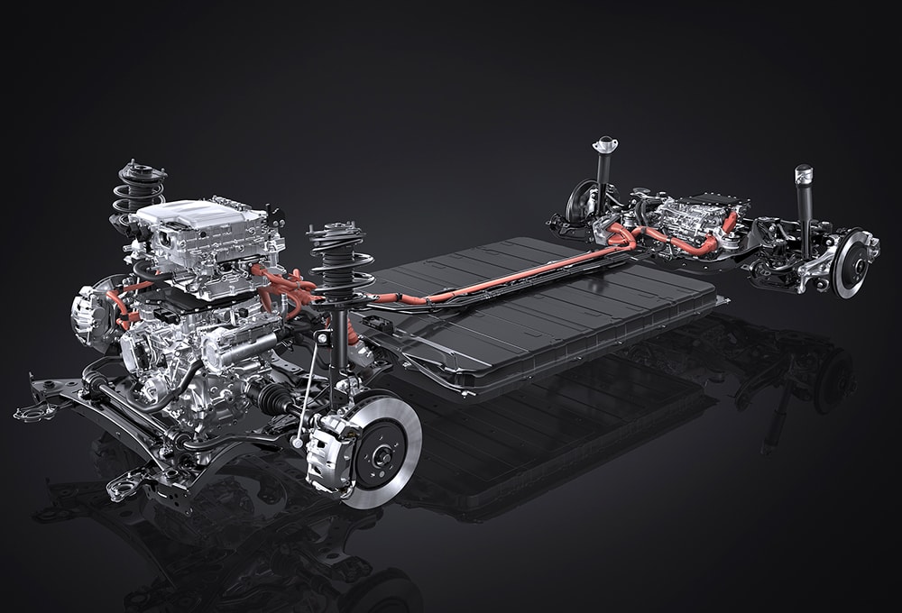 The RZ’s 71.4kW, 355V lithium-ion battery — developed by Tokyo-based Prime Planet Energy & Solutions, a Toyota affiliate company — has 96 cells, is sealed with urethane and cooled and heated with water that circulates through it. Lexus says the RZ’s EPA-estimated range is 220 miles (354 km) fitted with 18-inch wheels and 196 miles (315 km) with 20-inch wheels. Charging from 0 to 100% with a Level 2 240V / 32-amp charger takes 9.5 hours, the company claims. A 400-amp DC fast charger requires 30 minutes to go from 0 to 80%.