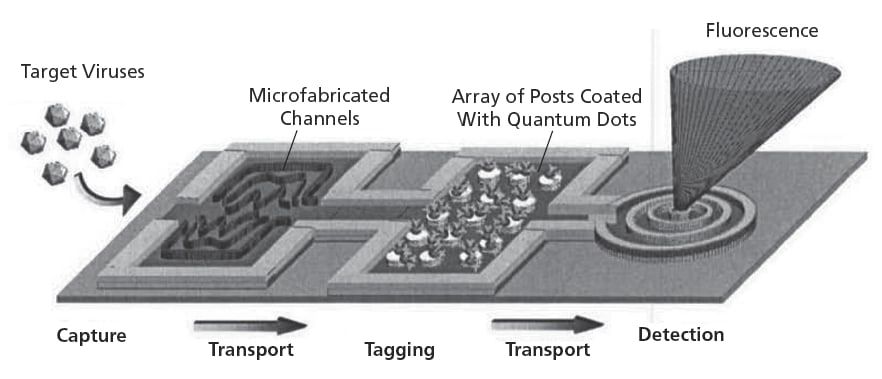 A promising approach toward the development of highly functional smart dust prototypes involves the design and fabrication of the prototypes as hybrid devices, in which biological nanomachines would be integrated into microfabricated synthetic structures. A representative example of a smart dust biosensor according to this approach is depicted schematically in the figure. In this example, antibody functionalized microtubules would capture analytes [that is, target chemical or biological agents (e.g., target viruses)] in a first chamber, molecular shuttles driven by biomolecular motors of which the microtubules would be integral parts would transport the analytes to a second chamber wherein the analytes would be tagged with quantum dots or fluorescent-dye-containing microspheres, then the shuttle motors would transport the tagged analytes to a third chamber, wherein the tags (and, hence, the analytes) would be detected remotely by fluorescence measurements.