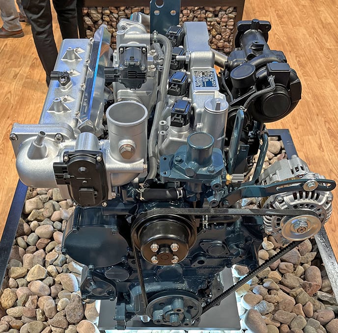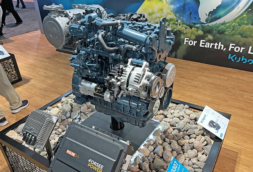 Kotaro Shiozaki, PR manager, Industrial Engine at Kubota Corp., said that hybrid powertrains also are an effective solution for reducing CO2 from industrial engines, and he’s confident they will be more than just an interim solution. Kubota displayed three hybrid solutions: a P0 micro-hybrid that will be available later this year, a P1 hybrid that provides brief periods of motor assist when high output is required and a P2 hybrid engine scheduled for production in 2025 that offers electric-motor drive.