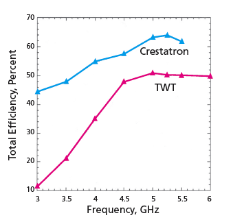 The degrees to which these advantages could be achieved were investigated in the design study, which was performed by use of CHRISTINE 1-D — a computer code developed previously for simulating the operation of a helix TWT in a large-signal regime. For example, large-signal simulations of a C-band crestatron operating at a potential of 5.850 kV and a current of 196 mA showed that this device could produce >250 W of power over a frequency span of 3 to 5.5 GHz. It was further shown that if the crestatron were to be combined with a two-stage depressed collector, the peak efficiency, reached at a frequency of about 5.2 GHZ, would be 64 percent. In contrast, a conventional TWT of similar power equipped with a two-stage depressed collector would exhibit efficiency of about 50 percent at this frequency (see figure). The crestatron as designed would also be a higher-power-density device, 40 percent shorter and 25 percent less massive, in comparison with the conventional TWT.