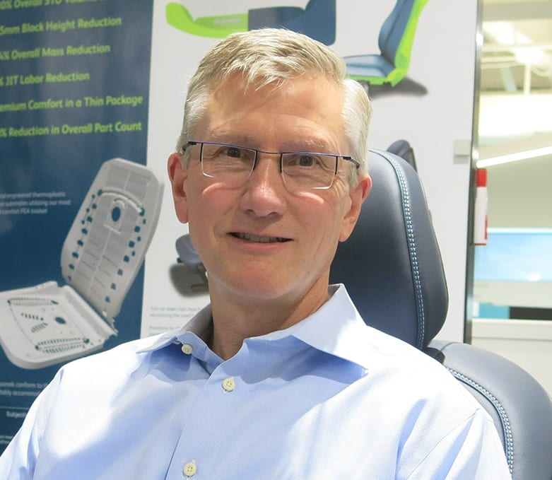 Sustainable plastics is another area of development at Adient, whose innovations include new ‘soft’ materials such as polyethelenes (PET) replacing hard polypropylenes (PP) for seatback panels and side valences. “The plastics industry is stepping up with new blends and fillers, hemp being a new idea,” Maddelein said. And new vinyl blends and BIO-Polymer rolled goods that give “premium appearance, more sustainability, and lower cost” are replacing cowhide as OEMs are moving away from leather seats, particularly for their EVs.