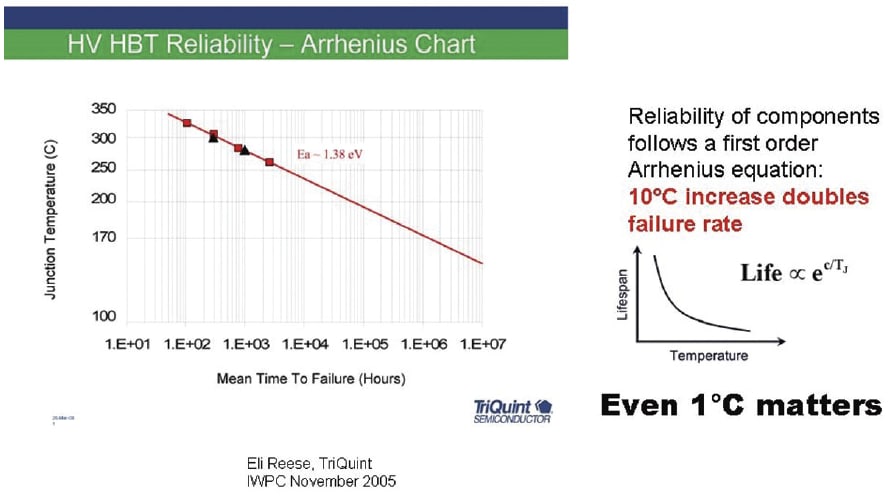 The higher the thermal impedance of a given board material, the lower the ability of that particular board material to draw heat away from component junctions, as well as impeding the transfer of component junction heat to any ancillary sinking materials that may be utilized. An excellent example of the importance of good thermal management is clearly depicted in the Arrhenius Chart (Figure 1), which basically states that for each 10°C rise in component junction temperature, component junction life expectancies will be halved.