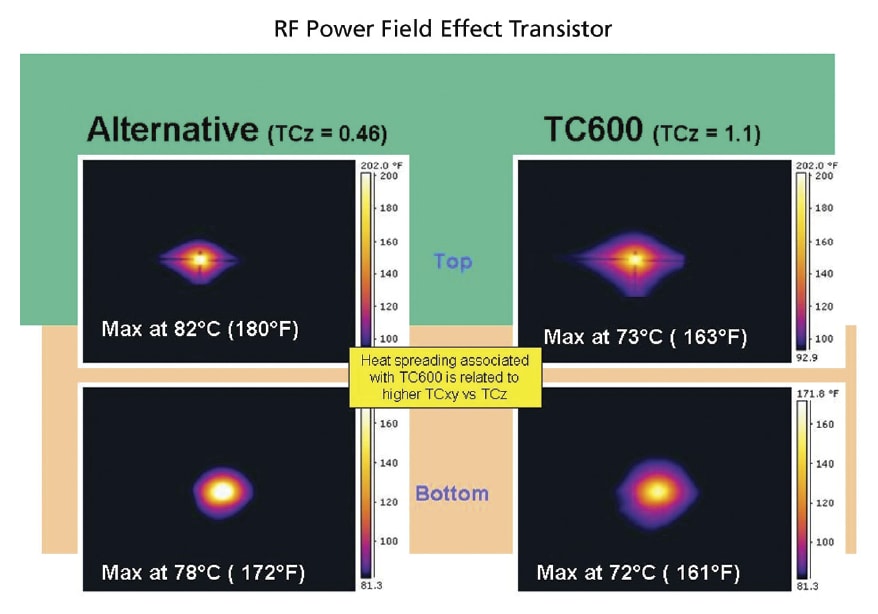 Thermal imaging (Figure 3) illustrates that materials having "in plane" thermal conductivities of 2 to 4 W/mk will increase a board's ability to remove componentgenerated heat by a factor of 10 to 20 times over that of conventional epoxy board materials, which typically have a thermal conductivity of 0.2 W/mk. It soon becomes evident that the utilization of thinner materials and higher-strength dielectrics, in conjunction with lower thermal impedance, provides a perfect solution for all highpower and high-density applications.