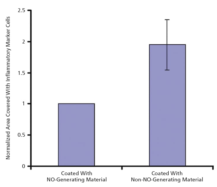 The focus of this research program is, more specifically, to develop new biomedical hydrogel and polyurethane coating materials containing immobilized copper(II) ions or other chemical species (e.g., organoselenium) that act as catalysts for in situ conversion of endogenous nitrosothiol compounds (e.g., nitrosoglutathione and nitrosocysteine) to NO, thereby enabling sustained local generation of NO at the surfaces of the implanted sensors. One of the accomplishments thus far has been the synthesis and characterization of a new material that includes a Cu(II)- cyclen compound covalently attached to a cross-linked poly (2-hydroxy- ethyl methacrylate). This material has been found to generate NO from endogenous nitrosothiols in solution at physiological pH. In preliminary in vivo studies using a lipophilic Cu(II)- cyclen compound blended into a biomedical-grade polyurethane coating material on sham subcutaneous devices implanted in rats, an apparent reduction in inflammatory response was demonstrated (see figure). However, proof that NO is the agent causing the observed improvement has yet to be obtained.