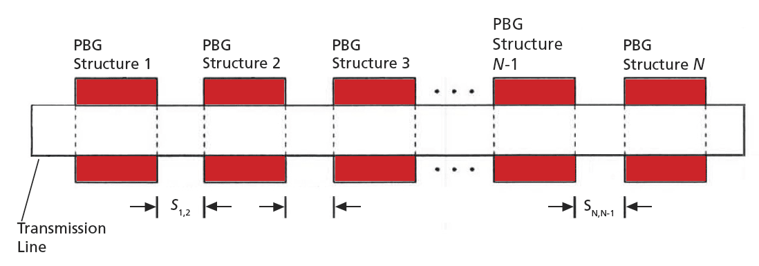 A filter according to the invention (see figure) includes at least three PBG structures at different positions along a transmission line. Each successive pair of PBG structures constitutes a successive PBG resonator. The distances between the resonators determine the narrow pass bands of the PBG-resonator pairs. Through appropriate choice of the number (N) of resonators and of the distances (S1,2, S2,3, ... SN-1,N ) one can obtain a single wider pass band. Depending on the requirements of a specific application, these distances could be equal or unequal.