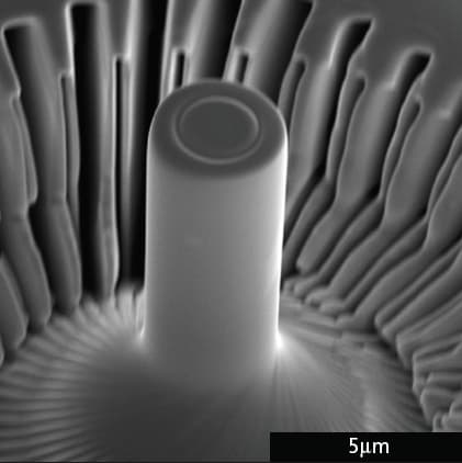 Post specimens of both materials were compression-tested in a commercially available nanoindenter apparatus. A flat punch indenter having a square cross section of 35 by 35 μm — much wider than the post specimens — was used to ensure uniaxial compression. Bulk specimens of the Pd40Ni40P20 BMG were compression-tested in a commercially available servohydraulic loading system. In each test, the loading rate was specified to obtain a nominal strain rate of 10-4/s. The load on the specimen load and the cross-head displacement were recorded with nano-newton and sub-nanometer resolution, respectively. The specimens were deformed to a specified displacement (or strain) followed by an incremental unloading. Dimensions of the post specimens prior to testing were measured by automated analysis of high-resolution scanning electron micrographs of the specimens. Specimen stresses and strains were calculated, in the same manner as in traditional compression testing, by use of the initial specimen dimensions and the load/ displacement data.