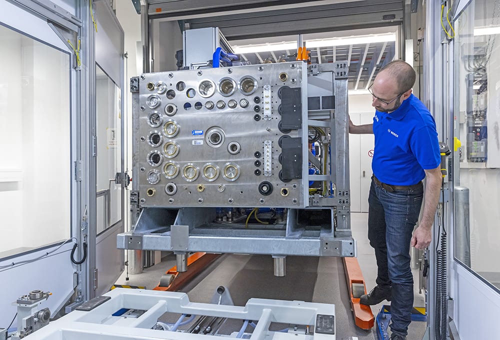 The same standard applies for fuel-cell manufacturing and testing. Bosch Manufacturing Solutions supplies more than 50% of the required manufacturing equipment. The test benches in Feuerbach were developed by the Homburg-based Bosch subsidiary Moehwald.