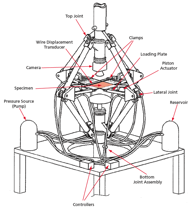 The apparatus can accommodate a variety of instrumentation: The loading plates can be instrumented with strain gauges for measurement of the applied forces. A wire displacement transducer can be installed between the loading plates in each four-bar linkage to measure the deformation of the specimen under the applied load. A camera aimed downward at the specimen can be mounted on the bottom of the top joint.