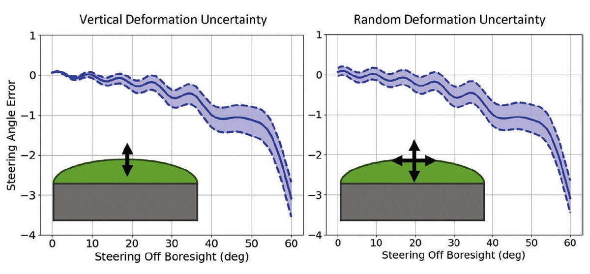With the modern software, a variety of UQ can be pursued including this type of analysis that cannot be calibrated out at production time. In this example, two analyses were performed in which vertical-only and all-direction deformations occurred. The H-plane beam steering error is shown for the nominal radome and the radome under deformation. Without the speed and accuracy of such modernized software, these advanced simulations could not be performed in a realistic timeframe.