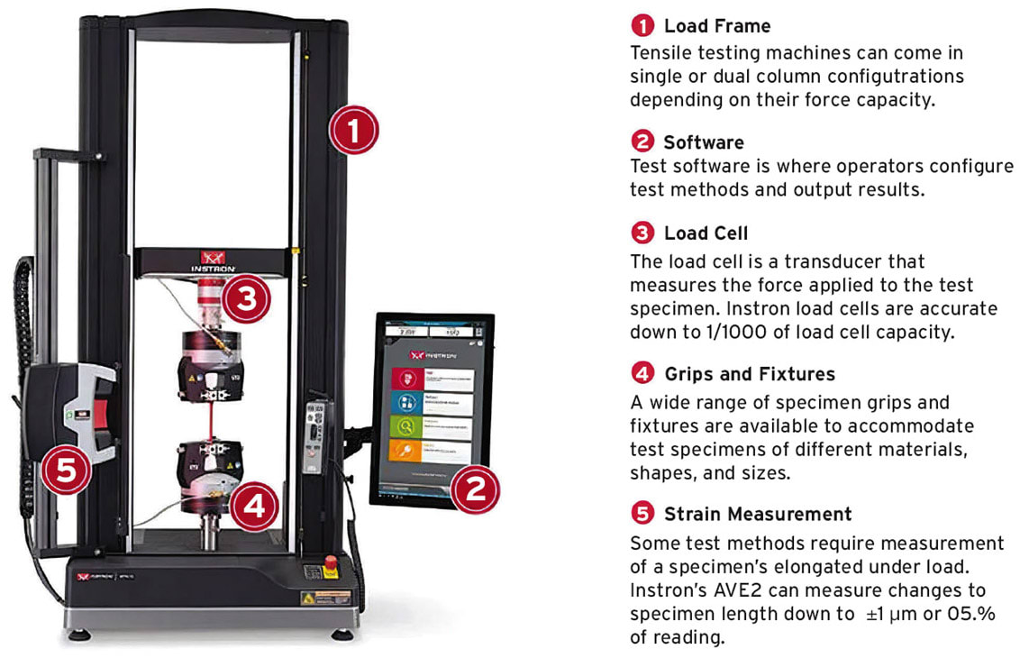 Universal test frames are generally either screw-driven or servohydraulic, which are both perfectly suited for uniaxial tensile testing experiments. A uniaxial test frame is comprised of several basic fixture components: loading device, a load cell, and a specimen gripping apparatus.