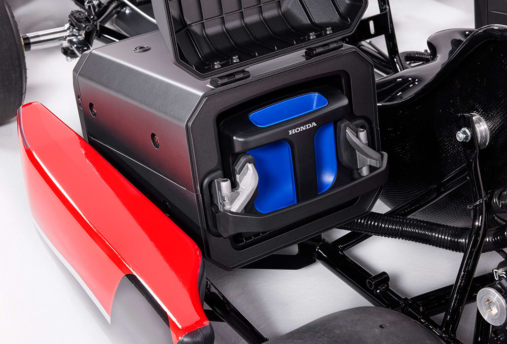 The first vehicle that we were exposed to was Honda’s eGX electric racing kart. The karts are powered by a pair of 50.26V/1.314 kWh lithium-ion battery packs that weigh in at just over 22 lbs. (10 kg) apiece. The batteries are easily swapable in seconds and wired in series to provide a run time of 35-45 minutes. According to Honda, total charge time is roughly five hours, but an 80% charge can be achieved in just one hour.