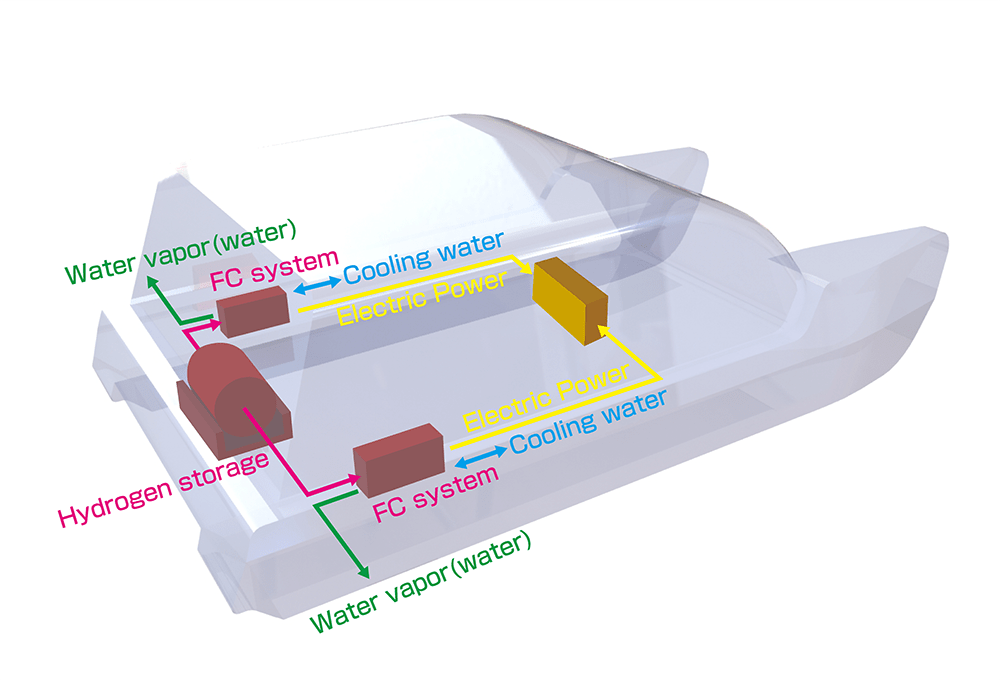 Over the next three years, Yanmar developed a marine HFC system using select components from Toyota Motor Corporation's MIRAI fuel-cell vehicle. Yanmar then performed verification trials with a test boat equipped with its fuel cells and high-pressure hydrogen storage tanks. The test boat also featured a Yanmar-developed power-management system that coordinated and controlled the operation of the fuel cell, as well as a lithium-ion battery pack and electric motors.