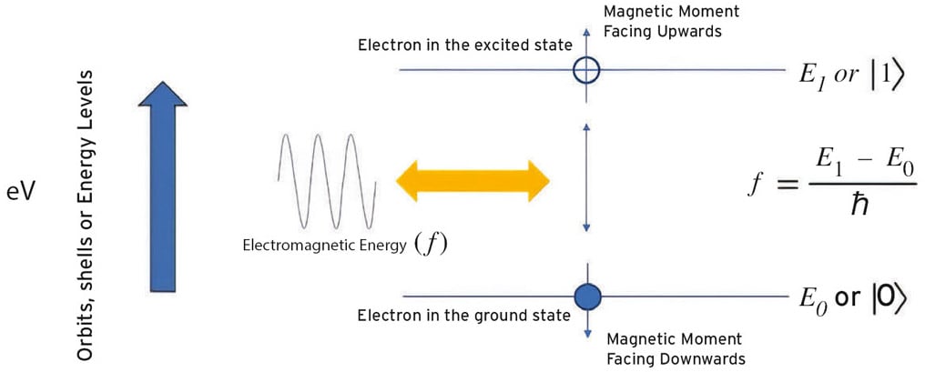 Electrons also possess a type of angular momentum called spin. As the electron moves from one energy level to another, the spin momentum changes. At the lower energy level, the momentum is pointing down, called the “spindown.” When EM energy is applied, the spin changes until the momentum is pointing upwards as the electron achieves the next energy level. This is the “spin-up” state. When the electron state can be defined like this, it is said to possess an eigenstate, as both the position and momentum are known and can be quantified through measurement. We can say spin-up represents a logical 1, and spin-down represents a logical 0. So, we now have a quantum implementation of a bit.