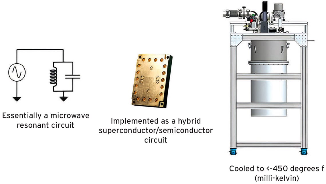 The inductive component in an actual qubit is replaced with a Josephson junction. While still fundamentally an LC structure, this modifies the inductive properties of the circuit so only two resonant or energy states can occur — since the system must be constrained to two levels, 1 and 0. The circuit is packaged in a protective shield with the RF connectors exposed, then is cooled to about minus 450 degrees Fahrenheit to ensure the system exhibits quantum behavior.