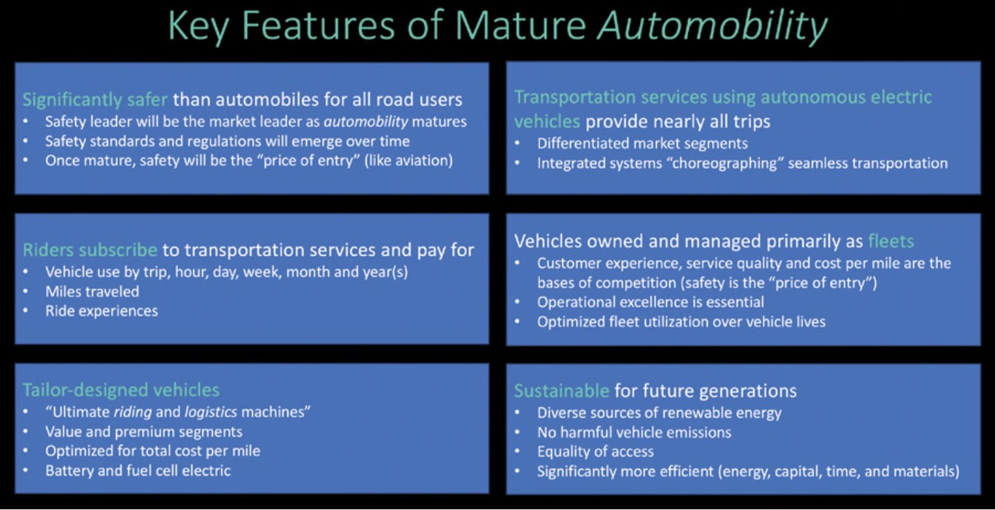 Automobility is on the verge of commercialization and is destined to grow to maturity through generational learning cycles. Big ideas have been conceived, fascinating concepts have been proven and prototype services have been demonstrated. There is much more hard work still to be done, but several companies are close to launching first-generation commercial automobility services in line with their driving systems’ proven capabilities.