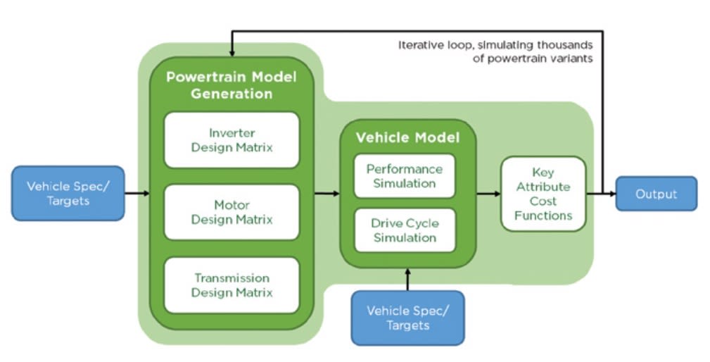 Savage explained that the key enabler in the process is the characterization of subsystem and component designs by their major properties, allowing the building of complete powertrain variants for simulation: “ePOP rapidly generates the necessary input data (masses, efficiency maps, etc.) for each electric powertrain subsystem for a range of topologies and layouts. It is this speed of data generation that permits the simulation of such a large number of powertrain configurations, which are then compared through intelligent cost functions and trade-off algorithms.”