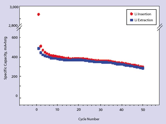 Coating the silicon nanowires with carbon has been proposed as a way of reducing the loss of capacity with cycling. Beneficial effects of coating with carbon include stabilization of the surfaces of the silicon nanowires by blocking oxygen, increasing electrical conductivity, and providing a cushion material to relieve the stress of volume expansion. An investigation of the effects of coating with carbon was in progress at the time of reporting the information for this article.