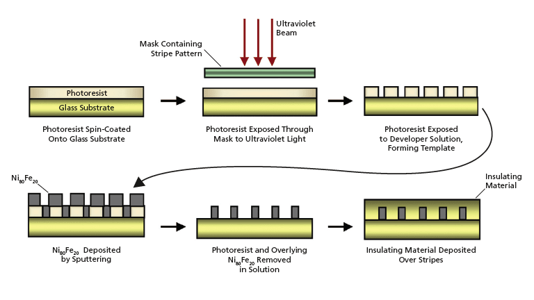 The development effort has also included design, fabrication, and characterization of specimens, containing small numbers of nanoscale ferromagnetic stripe, pillar, and wire structures, as prototypes for assessing feasibility of fabricating ferromagnetic/insulator cores containing large numbers of wires in nanostructured arrays. The ferromagnetic material that has been used in this effort is permalloy (Ni80Fe20). Arrays of nanoscale Ni80Fe20 stripes have been synthesized by use of a combination of lithography and sputtering (see Figure 2). Template-assisted electrodeposition has been demonstrated to be feasible as a means of fabricating arrays of microscale Ni80Fe20 wires (the nanoscale has not yet been reached because of limitations on the means available for drilling narrow holes in templates). It was shown to be possible to fabricate ferromagnetic wires by electrodeposition of Ni80Fe20 onto Cu wires held at the desired lateral distances in a custom fixture. (It is envisioned that the wires would later be potted in epoxy, and the resulting workpiece would be machined to the final desired core size and shape).