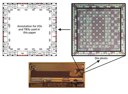 An AC coupled interconnect (ACCI) has been developed that could be used to create multiple solutions to contactless chip-to-chip communications. Assembly and testing of a 0.18 um bulk CMOS chip containing multiple circuit experiments were performed. Figure 1 shows the chip floorplan, chip layout for the wire bonded experiments, and a microscope photograph of the die. The experiments tested in this phase of measurements were located around the periphery of the die in the band designated in the die photo of Figure 1.
