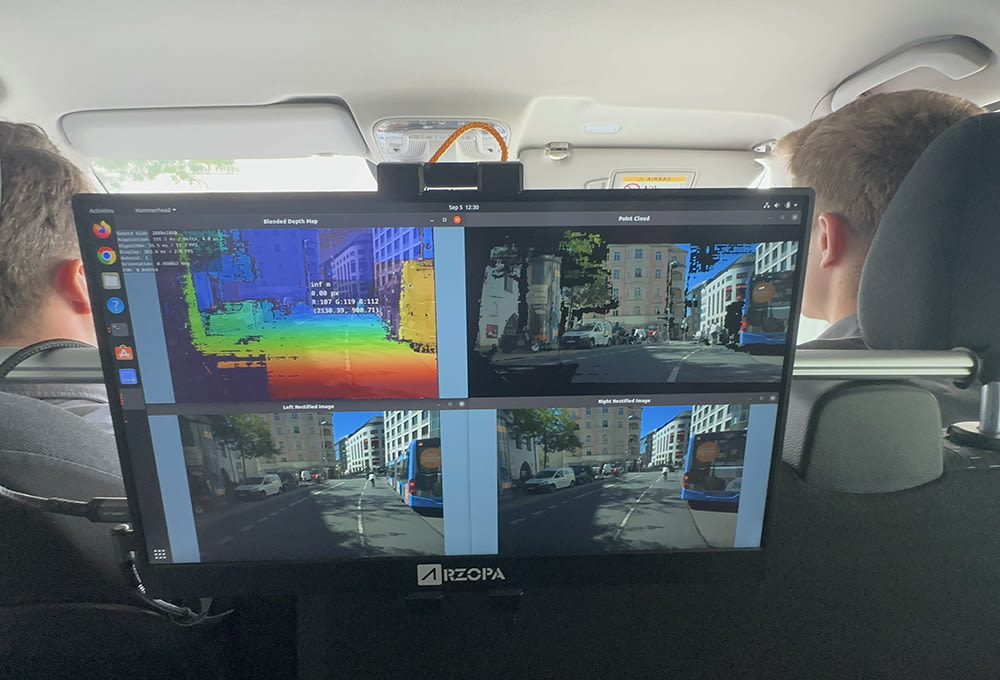 During IAA 2023, Nodar provided test rides through the city’s crowded streets to showcase a prototype Hammerhead system displaying live images of the world in front of the vehicle measured by distance. Being able to build a live, 3D point cloud like this is not new, but doing it with two off-the-shelf cameras that can be positioned anywhere on the vehicle and algorithms that accurately measure distance is, especially without a lidar sensor on board, unusual.