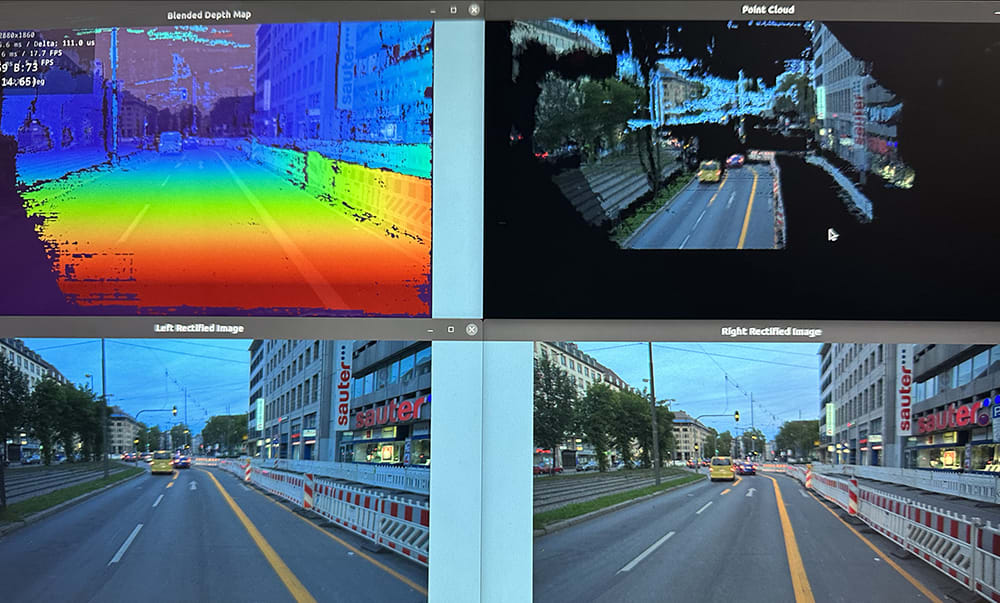 Riding in the test vehicle in Munich, I could see dark spots in Nodar’s point cloud called stereo shadows. These are the result of two cameras looking at the same thing when the view is occluded. Instead of trying to determine the distance, the system just leaves it blank.