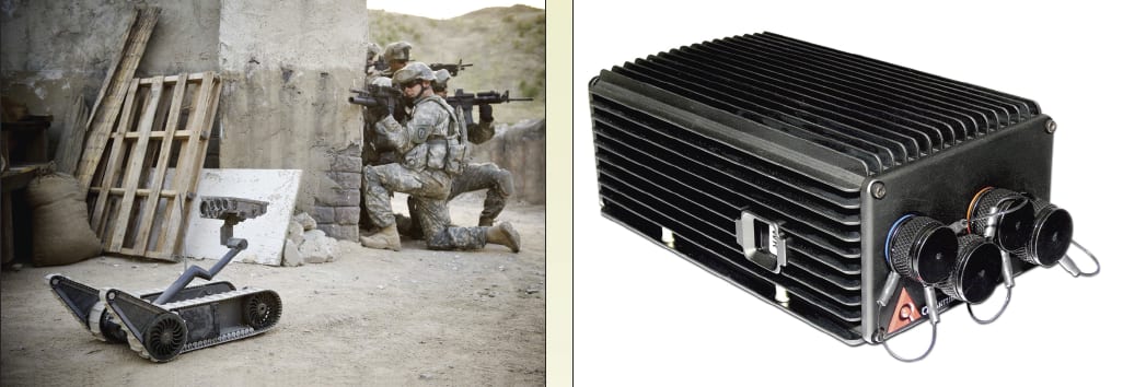 Reliability is another key concern. Identifying a lightweight processor that is sufficiently ruggedized can be a difficult proposition. Not only should the processor be enclosed in an indestructible casing (to prevent it from being damaged as the soldier crawls or drops to the ground), but it also needs to be sufficiently protected from the elements. This means that the unit should be rated for extreme temperatures, be sand- and dirt-proof, and be capable of running in wet conditions. This balance of ruggedness and weight requires a different approach. Even traditional "tough" laptop computing solutions are insufficient. Robotic control requires an embedded system that is specifically designed for deployed military applications, such as the Thermite Tactical Visual Computer shown in Figure 3. Such a computer is necessary for reliability. All of the graphics capability in the world is worthless if the processor is incapable of performing in the field.