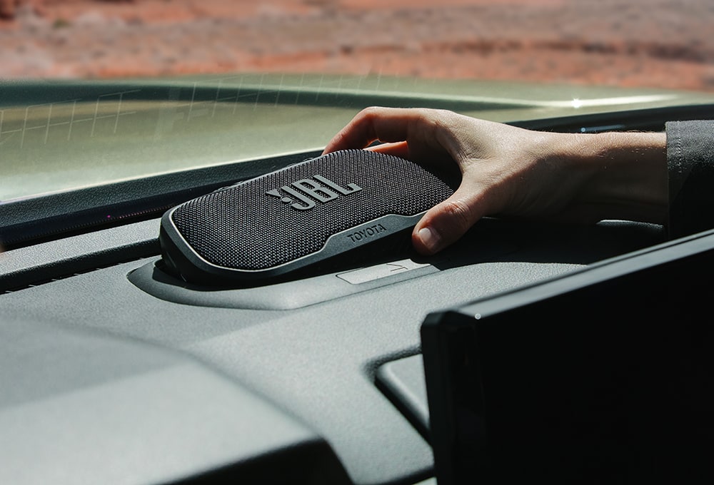 The Tacoma’s JBL Flex Bluetooth Speaker and Dock is patented docking system that enables a detachable JBL speaker to function as one of 10 speakers in the vehicle’s premium audio system, or as a portable speaker with up to 10 hours of solid-state battery life. The waterproof speaker is charged while docked in the truck or via a USB port outside the vehicle.