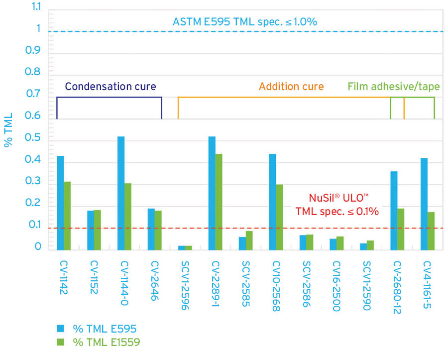 Figure 1 shows the percent of TML at the end of testing as compared using ASTM E595 versus ASTM E1559. Figure 2 lists the NuSil® space-grade silicones included in the test, their cure chemistry and the application for each tested formulation.