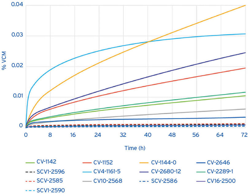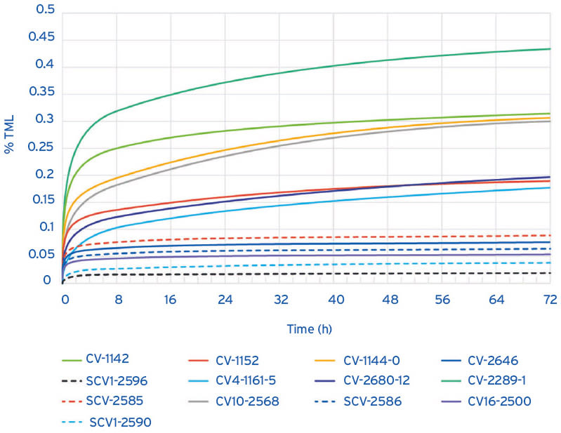 A silicone manufacturer used both ASTM E595 and E1559 to analyze a suite of its products, including condensation and addition cure materials and sheeting products. The purpose was to give an overview of the company’s low outgassing (CV product designation) and ultra-low outgassing (SCV product designation) products and how the outgassing kinetics differ between them, to aid design engineers in material selection. The ultra-low outgassing materials were developed specifically to meet the most stringent standards for space applications, where even low amounts of volatiles in traditional space-grade materials might outgas and cause potential problems. These materials are expected to demonstrate a TML of ≤ 0.1 percent and CVCM of ≤ 0.01 percent by ASTM E595.