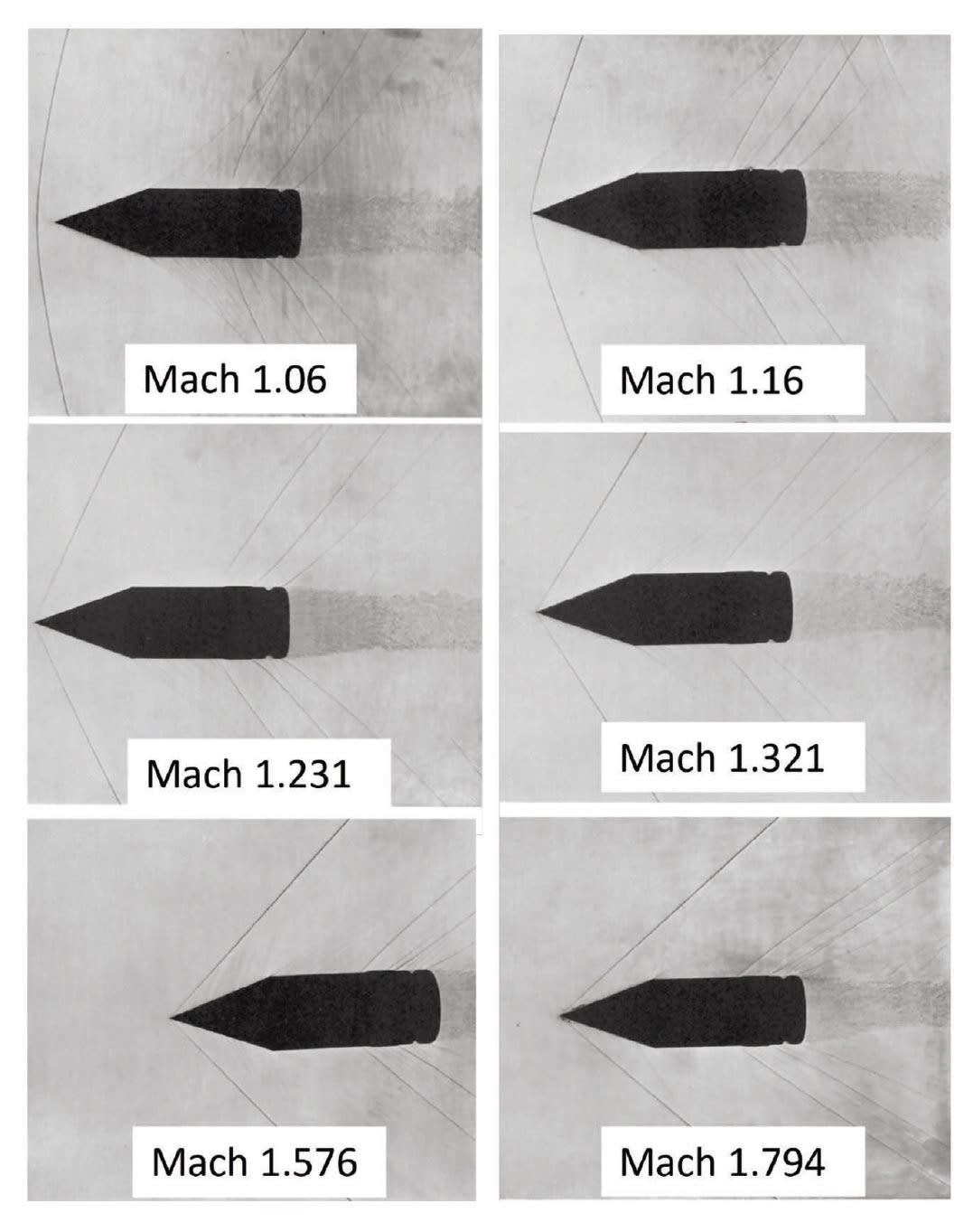 In 1936, Maccoll conducted experiments to image the Mach cone of antitank rounds traveling at supersonic velocities. Some of the photographs captured by Maccoll are shown in Figure 1. In the image on the top left, labeled Mach 1.06, the bow shock wave can be clearly observed to be out in front (left) of the point of the anti-tank round. There is a significant separation between the shock wave and the tip of the round. Also, the large radius of curvature of the shock wave results in a large volume of air in between the anti-tank round and the shock wave. In the next photo (top right), labeled Mach 1.16, the bow shock appears very close to the apex of the round. In addition, the radius of curvature has significantly decreased in comparison with Mach 1.06 and the shock wave has taken on the shape of a very blunt cone. With the progression to higher speeds, the angle of the bow shock, to the axial direction of the round, continues to decrease from Mach 1.231 to Mach 1.321 and then to Mach 1.576. Finally, at Mach 1.794, we see the smallest angle of the bow shock to the round’s axial direction.