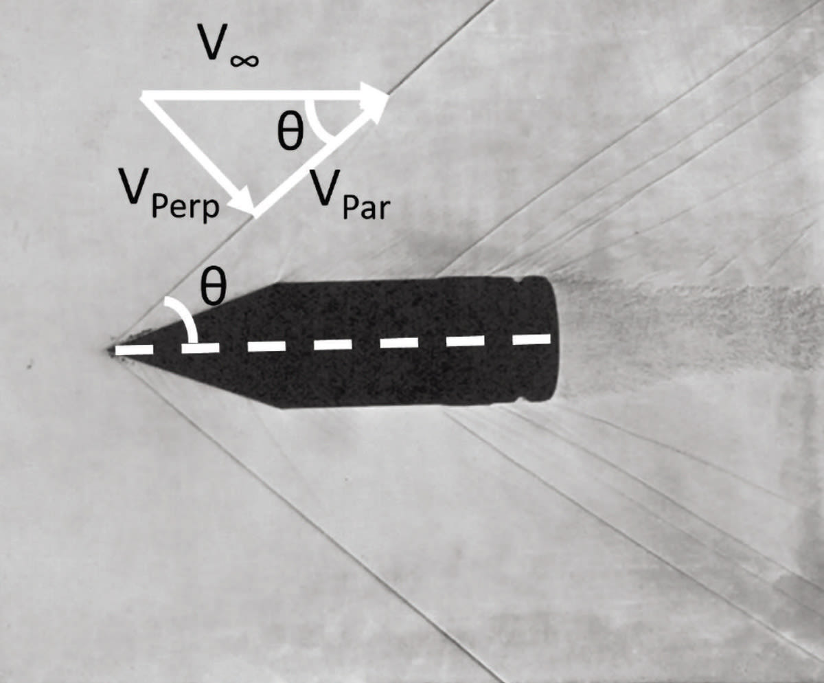 Figure 2 shows the annotated photo of the anti-tank round at Mach 1.794. The tilting angle (θ) of the bow shock is with respect to the centerline (dashed white line) of the anti-tank round. The components of the free stream velocity (V∞) are shown, where VPerp is the component perpendicular to the shock front and VPar is the component along or parallel to the shock front.