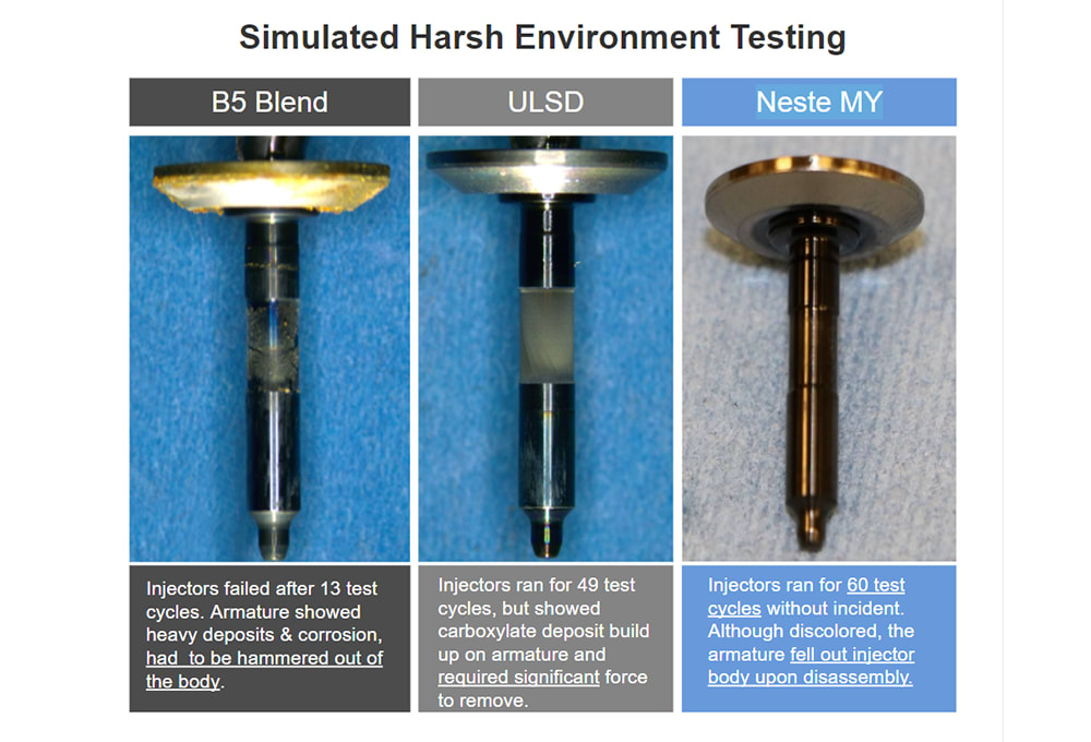 The fuel is incredibly clean. It looks and smells like water and is free of contaminants. Which means it will not start producing injector deposits that decrease the performance of the engine over time. Detroit Diesel did some testing on a DD15 where they artificially aged the fuel and ran it through an engine on a test bed. They were testing to see what would happen first: would the fuel break down and go off spec as time goes on, or would the parts physically fail because of deposits and corrosion? The B5 bio-blend lasted 13 days in the test before the injector seized. B0 pure fossil made it roughly 43 days. The fuel broke down enough that it had a lot of acids and the injector had deposits. After two months of testing with our fuel, they found that it didn’t break down when they pulled the injectors apart there were zero deposits.