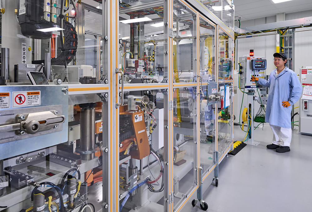 GM and Honda engineers developed new manufacturing techniques and approaches to automation that Freese claims enable reductions in fuel-cell cost and increased productivity. For example, the coated membrane film arrives at the 70,000-ft.sq. Brownstown, Michigan, plant in large rolls. Feeding off the roll at a rate of seven meters per minute, the film is automatically scanned to detect any defects at the micron level, Freese explained. It is then cut to length, shaped, and a gasket layer is applied. The membrane then moves into a highly robotized stacker. In 10-second intervals, robots take the elements and build them into the Hydrotec stacks.