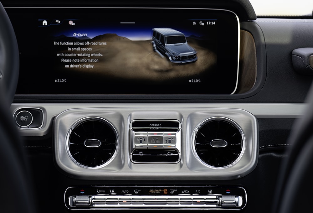 The G-Turn’s Spin-o-Rama seems as much a YouTube gimmick as a practical tool, but the G-Steer feature is a welcome gain. In tight quarters, the Benz can drag an inside wheel while overdriving an outside wheel, for an instant pivot around obstacles with no tiresome three-point turns. On a slalom course, the G-Steering Benz wound between cones better spaced for a Miata than an SUV.