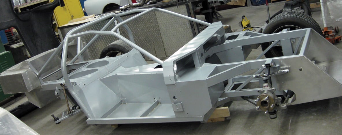 In doing so Adams and his client achieved three gains: lower seating positions, higher torsional stiffness, and reduced weight. The final 300-lb (136 kg) frame provided an exemplary 13,000 ft·lb/degree torsional stiffness. “That’s a 10-fold increase over the original ladder frame’s stiffness combined with a 200-300-lb overall weight savings,” he explained. (In contrast to the original ladder design, Adams’s frame included the cowl and floor panels.)