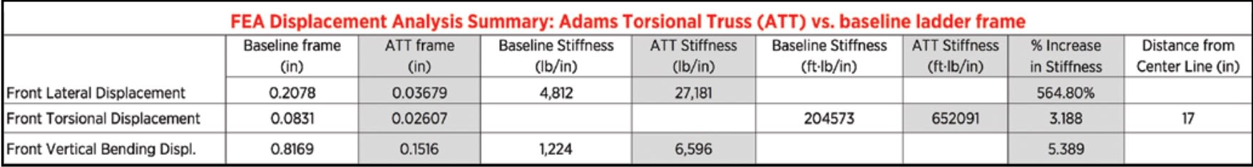 The analysis revealed that ATT reduced maximum stress by 3% to 33% while increasing stiffness by 3.19% to 5.39%. The ATT design consisted of 0.060-in-thick (1.5-mm) A36 sheet steel throughout, yielding a 40-lb (18-kg) mass savings over the ladder frame; see chart.