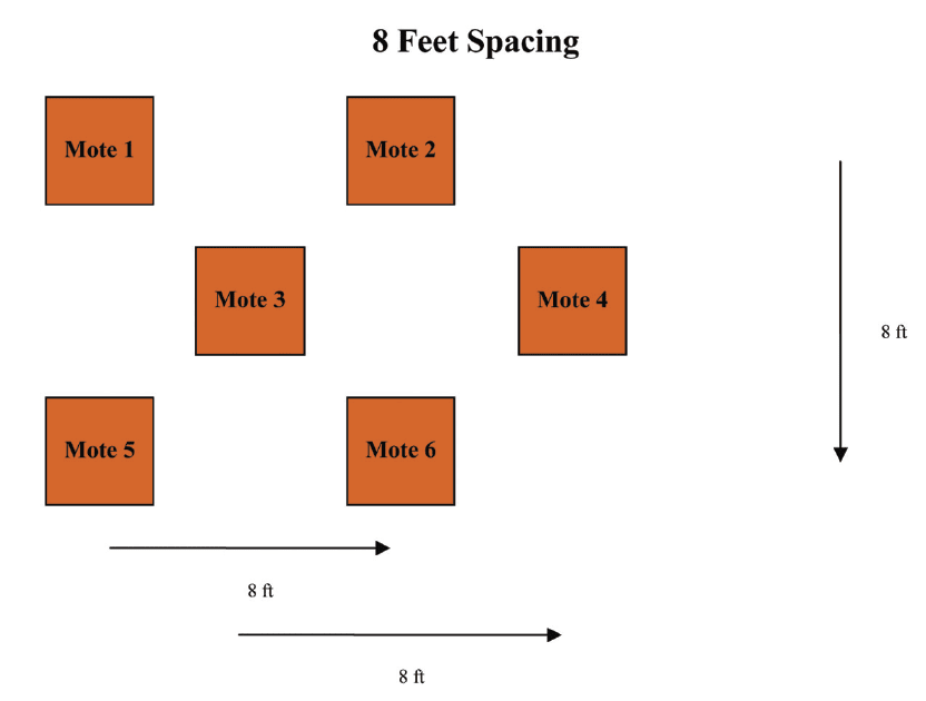 The mote intervals were then expanded to 8 and 12'. The 8' configuration still provided reliable and consistent results. The 12' configuration showed some readings, but was not consistently able to detect metal from 6' away. So, an 8' interval between motes was optimal for the six-mote network, providing redundancy of motes while avoiding blind spots within the network (see figure).