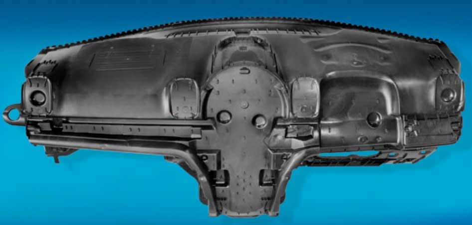 This application provides a sustainable alternative to conventional petroleum-based foams, at a lower weight and cost with more design flexibility, Ford engineers claim. Castor oil-based foam provides for lower molded density, the ability to be foamed in as little as 4-mm cross sections, and superior bond strength to mating materials. Foam in place tooling, where a cast PVC, TPE, or TPU skin is placed in the mold with a hard plastic retainer and the foam is injected between these two components, is used for processing. A claimed weight savings of 20-40% (depending on foam thickness) and a cost savings of $2 per average foamed-in-place instrument panel is achieved.
