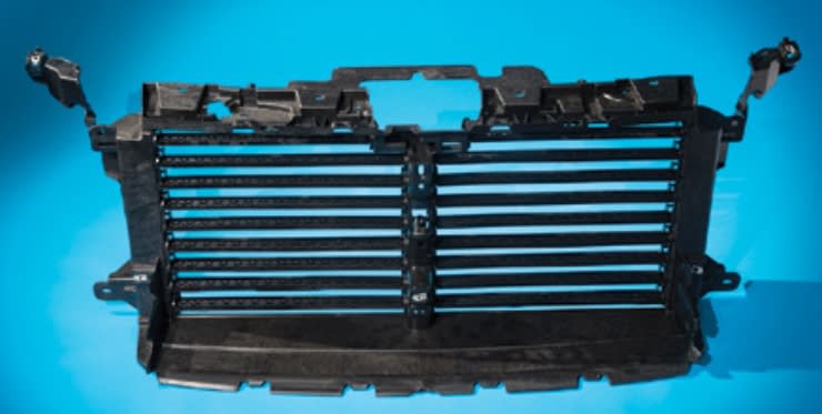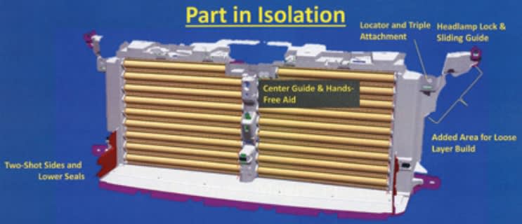 Possibly the largest two-shot active grille shutter unit in production, the Ford Expedition (U553 program) structure was designed with an integrated locating and attaching system for consistent fit between the grille and headlamps. This helped eliminate the need for front-end module (FEM) assembly, dunnage and shipping. In addition to reducing variable and piece costs by an estimated $5 with an entirely thermoplastic solution, the enhanced design achieved $16 internal assembly cost reduction per vehicle and eliminated around $45 auxiliary costs by negating the need for a FEM.